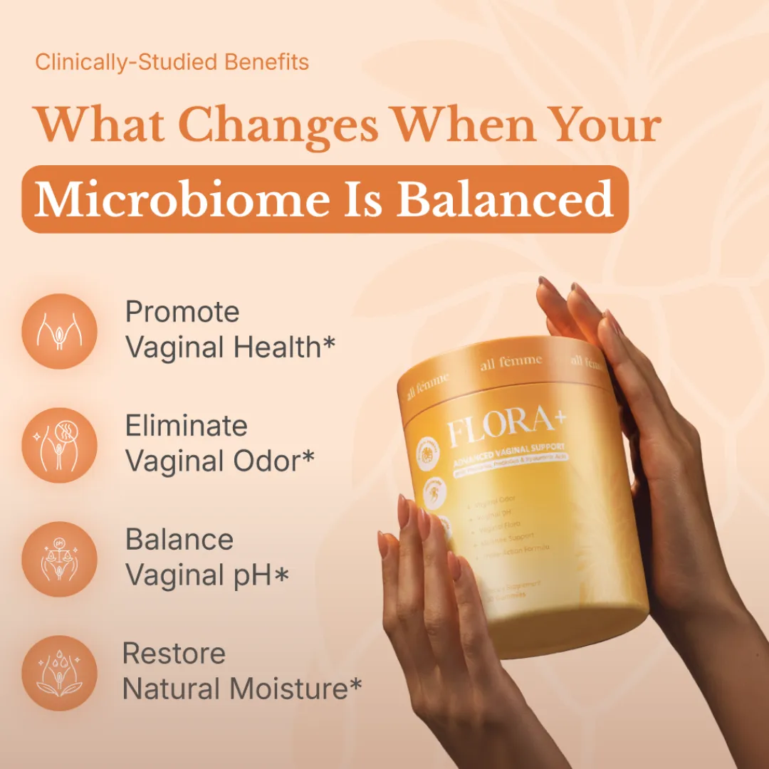Flora+ targets the real root cause: the vaginal microbiome. Not the surface. Not the symptoms. The actual bacteria causing the odor, dryness, and discomfort.